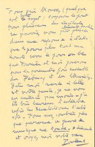 Marie-Blanche de Polignac « pour entendre ma Sonate pour piano et vcelle que Fournier et moi jouerons pour les vrais amis ». Il le prie de l’aider : « Fournier et moi étant absents de Paris la publicité pour notre récital n’a pas été très soignée. […] Ne pourriez-vous pas dimanche prochain glisser dans une réponse à Nadia que 3 jours plus tard ma sonate verra le jour ou bien que Fournier et moi jouerons pour la première fois ensemble du Debussy et du Stravinsky. Dites-moi merde si telle est votre pensée, je ne vous en aimerai pas moins »… Il a été très heureux d’entendre ses Bénédictiones dernièrement : « Vous savez combien plus que personne ce genre de musique me touche »…