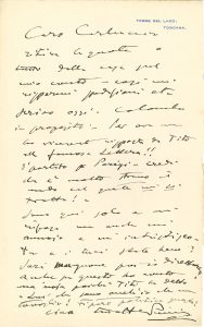 compte, pour éviter les expéditions… « Colombo in proposito »… Il a reçu la réponse de Tito [Ricordi] à la fameuse lettre… Il est à Torre seul, et se repose, mais aussi s’ennuie et s’entriste (« intristico »)…