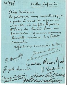 réunion de joyeux amis écrivent à la comtesse pour lui montrer « qu’on a pensé à vous sur ce jour mémorable où on fête le passage à Paris du Cousin Pons en permission, que nous pourrons bientôt nommer le “Petit Caporal” »… Sous la signature du musicologue Jean Marnold, Ravel a signé : « Conducteur Maurice Ravel ». Ont également signé Georgette et H. Marnold, Henri Lichtenberger, et l’abbé Léonce Petit : « Léonce Petit (Sect. 102), poilu sans métaphore », avec note de Marnold : « Parce qu’il s’est laissé pousser la barbe ».