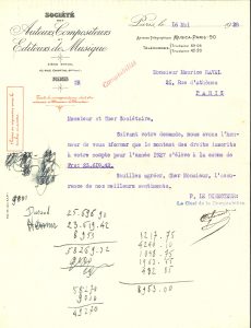 Maurice RAVEL. Comptes autographes sur une L.S. à lui adressée, 16 mai 1928 ; 1 page in-4 à en-tête de la Société des Auteurs, Compositeurs et Éditeurs de Musique.. Le service comptabilité de la Société des Auteurs l’informe que...