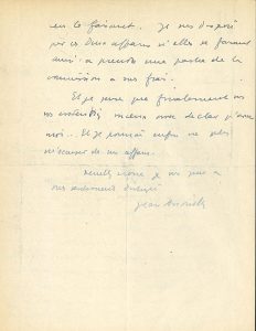 rédigé à cinq pour cent. Pensiez-vous que j’oublierais de le lire ou est-ce une erreur ? »… Il demande de prendre contact avec Leclair [de la Société des Auteurs et Compositeurs dramatiques] : « Je suis désespéré par ces deux affaires si elles se faisaient ainsi à prendre une partie de la commission à vos frais. Et je pense que finalement vous vous entendrez mieux avec Leclair qu’avec moi… Et je pourrai enfin ne plus m’occuper de mes affaires »…