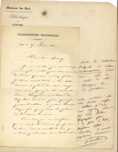 plus lettre du baron Textor de Ravisi), Vincent Campenon, Victor Cousin, Charles Daremberg (17 à Charles Jourdain), De Bure frères, Édouard Dulaurier (sur l’Arménie), Firmin-Didot, Albert Duruy (4 à Charles Jourdain), Victor Duruy (8 au même), Adolphe Garnier, J. Gay, Eugène Gérusez, A. Grille, Joseph von Hammer-Purgstall (avec réponse de son confrère orientaliste Amable Jourdain à la suite), Karl-Benedikt Hase (plus programme de son cours de grammaire comparée), Camille Jullian, Marc-Antoine Jullien (4), duc de La Force, Daniel Langlois-Berthelot, Edmond Le Blant (20 à Ch. Jourdain), Eugène Ledrain, Antoine Le Roux de Lincy, Charles Letourneau, Émile Levassseur (8 à Ch. Jourdain), Charles Louandre, duc de Luynes, Magimel, Louis Madelin (3), Émile Mâle, Henri Martin, Alexandre Mazas, Paulin Paris, Charles Pougens (3), Maurice Prou (7 à la veuve du chartiste Pierre Gautier), Félix Ravaisson-Mollien, Antoine-Augustin Renouard, Saint-Marc Girardin, Frédéric Sclopis, Antoine-Isaac Silvestre de Sacy, Félix Solar, William Buell Sprague, Philippe Tamizey de Larroque (9 à Jourdain), Paul Thureau-Dangin, A. Touroude, Pierre Turbat (à L. de La Sicotière), Jules Vincent (premier administrateur de la BN pendant la Commune, avril 1871), Marc de Vissac…