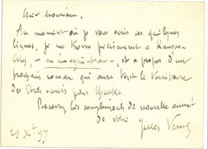 Jules VERNE (1828-1905). L.A.S., 29 décembre 1897 ; carte oblong in-16.. À propos du Testament d’un excentrique [qui sera publié en feuilleton dans le Magasin de l’éducation et de la récréation, 1899, puis en grand format illustré chez...