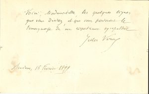 Jules VERNE. L.A.S., Amiens 18 février 1899, à une demoiselle ; 1 page oblong in-12 (traces de collage au dos ; photographie jointe).. « Voici, Mademoiselle, les quelques lignes que vous désirez, et qui vous porteront le témoignage de ma...