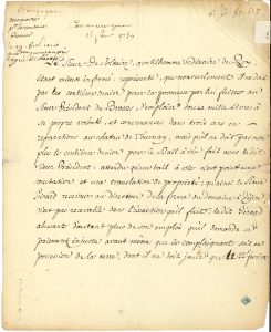 achète au Président de Brosses, du Parlement de Bourgogne, le château de Tournay, sous forme de bail à vie avec le titre comtal qui y est attaché. Ces pièces traitent du contentieux qui oppose les deux parties, notamment pour le paiement du centième denier. . Le premier document porte cette note de la main de Voltaire : « Memoire pr le centieme denier » : « Le Sieur de Voltaire, gentilhomme ordinaire du Roy, étant mieux informé, représente, que non seulement il ne doit pas le centième denier pour la promesse par lui faitte au Sieur Président de Brosses, d’emploïer douze mille Livres à sa propre volonté, et convenances dans trois ans en reparations au chatau de Tournay, mais qu’il ne doit pas non plus le centième denier pour le bail à vie avec ledit sieur Président »… Le second document précise que la cession de cette terre doit être effectuée le 22 février 1759, et que le contrat stipule que « l’acquéreur fera au bout de trois années des réparations qui monteront à douze mille livres », etc. . On joint une P.S. de François Arouët (père de Voltaire), 18 janvier 1693 (vélin oblong in-8 avec cachet fiscal).