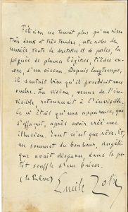 Émile ZOLA (1840-1902). Manuscrit autographe signé ; 1 page in-8 (contrecollée sur carte).. Extrait de son roman Le Rêve (1888). « Félicien ne tenait plus qu’un rien très doux et très tendre, cette robe de mariée, toute de dentelles...