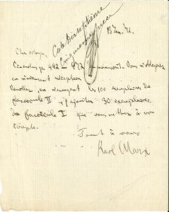 Karl MARX. L.A.S., [Londres] 13 janvier 1872, à « Cher citoyen » [Maurice Lachâtre ?] ; 1 page in-12 (cote d’inventaire notarial) ; en français.. « Ci-inclus p. 442-472 du manuscrit. Vous m’obligerez en m’accusant réception....