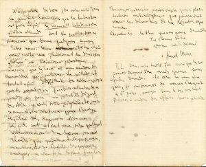 gendre Paul Lafargue. .Dès réception de sa lettre trop flatteuse, il a prié le traducteur d’expédier à Paris le manuscrit des premières livraisons. « Quant à la biographie, vous m’obligerez en n’insistant pas sur sa publication immédiate. Mon ami F. Engels, qui fournira les détails à Lafargue, est dans ce moment trop excédé de travail pour s’en occuper. D’après mon opinion il ne faut pas perdre du temps et rien ne nous empêche de publier la biographie plus tard. Je suis tout-à-fait de votre avis qu’il ne faut faire aucune communication aux journaux relativement à la traduction française. Avec l’édition russe on prend les mêmes précautions, et malheureusement la France subit aujourd’hui un régime “russe” ». Il demande que l’on précise « dans la première livraison que la traduction est faite d’après le manuscrit de la deuxième édition allemande dont la publication ne commencera que dans quelques semaines. Puis il souligne l’originalité de son travail : « J’espère que le livre ne vous vaudra des nouvelles persécutions. La méthode est tout-à-fait différente de celle appliquée par les socialistes français et autres. Je ne prends pas pour mon point de départ des idées générales comme “l’égalité” etc., mais je commence, au contraire, par l’analyse objective des rapports économiques tels qu’ils sont et c’est pour cela que l’esprit révolutionnaire du livre, ne se révèle que graduellement. Ce que je crains, au contraire, c’est que l’aridité des premières analyses ne rebute le lecteur français. Néanmoins, il y a dans les premiers chapitres quelques plaisanteries antireligieuses qui pourraient blesser les dévots de la république rurale »… En post-scriptum, il rappelle que leur traité prévoit le versement de 2000 francs quinze jours après demande. « Si cela ne vous gêne pas, je préférerais de verser l’argent le 1er juillet, parce que dans le cas contraire j’aurais à vendre des effets bien placés »… .On joint une L.A.S « K.M. », [Londres] 15 mars 1873, à Maurice Lachâtre] ; quart de page in-8 ; en français. « J’avais oublié à enfermer votre réponse dans ma lettre »…