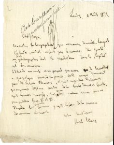 Karl MARX. L.A.S., Londres 4 août 1873, au « Cher citoyen » [Maurice Lachâtre] ; 1 page in-12 remplie d’une petite écriture serrée (cote d’inventaire notarial, 2 infimes trous de liassage, bas légèrement effrangé) ; en français.. ...