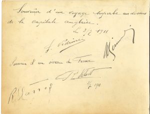 quatre aviateurs qui réussirent ce jour-là l’étape Calais-Londres, du Circuit européen. « Souvenir d’un voyage superbe au-dessus de la capitale anglaise », du premier à arriver, Védrines, signé aussi par Kimmerling (quatrième). « Souvenir d’un oiseau de France », du deuxième à arriver, Vidart, signé aussi par Garros (cinquième). Au verso, quatre inscriptions signées (1910).