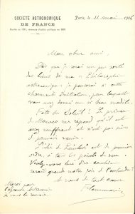Camille FLAMMARION. L.A.S., Paris 11 mai 1906, à un ami ; 1 page in-8, en-tête Société Astronomique de France.. « Dès que je serai un peu sorti des liens de ma Philosophie astronomique je penserai à cette charmante Initiation, pour...