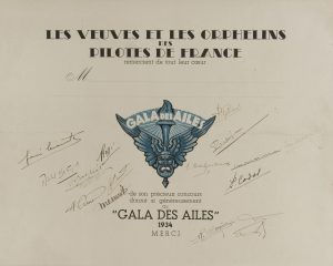 pilotes de France remercient de tout leur cœur M. [laissé en blanc] de son précieux concours donné si généreusement au “Gala des Ailes” 1934 »… Ont signé, outre Mermoz : Maurice Rossi, Léon Bathiat, Louis-Julien Gaubert, Jean Dagnaux, Gustave Lemoine, Paul Codos, etc.
