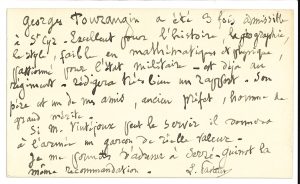 Tourangin a été 3 fois admissible à St Cyr. Excellent pour l’histoire, la géographie, le style, faible en mathématiques et physique, passionné pour l’état militaire – et déjà au régiment – rédigera très bien un rapport. Son père est un de mes amis, ancien préfet, homme de grand mérite. Si M. Vintéjoux peut le servir il donnera à l’armée un garçon de réelle valeur »…