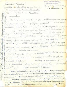 psycho-pédagogie, à Bruxelles ; 1 page in-4 dont 9 lignes de la main de Schweitzer, en-tête cachet encre Hôpital du Dr Schweitzer (bord effrangé, un coin manquant sans perte de texte, bas renforcé au scotch).. Mlle Kottmann exprime les regrets du Dr Schweitzer, de ne pouvoir participer à la Revue : « Il mène une vie très dure et sans repos. Occupé actuellement à la construction d’un village pour malades lépreux, il ne lui reste que les heures de nuit pour traiter des affaires de l’hôpital. Et pour terminer ses manuscrits de théologie et philosophie »… Schweitzer prend la plume pour ajouter : « Je dois rester absolument concentré sur mes travaux en cours, que je voudrais mener à bonne fin dans les heures de nuit, étant occupé durant la journée dans mon hôpital. J’ai donc dû renoncer depuis longtemps à écrire sur d’autres sujets. Celui que j’aurais eu à traiter dans votre revue m’aurait bien tenté. […] Je me traîne dans la fatigue de jour en jour »…