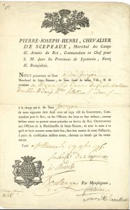 passer pour le Sr Braunsweig, négociant juif ; Jacques de Flesselles, L.S., Moulins 26 août 1764 au maréchal de Biron à propos des revues du Régiment des Gardes françaises ; fin de L.A.S. du baron de Joursanvault, Beaune 6 juillet 1767, commande à un libraire de nobiliaires de Picardie, Provence, Champagne ; Pierre-Josph chevalier de Scepeaux, 1 P.S., Saint-Étienne 29 novembre 1775, laisser passer pour un marchand en Alsace avec 6 canons de fusils de chasse ; maréchal de Ségur, Versailles 31 août 1783, etc.. On joint 6 lettres ou pièces par Henriette Clauzel, Dubruel, le duc de Maillé, le maréchal Victor duc de Bellune, etc.
