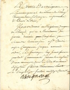 Joseph de Montesquiou, dit le comte d’ARTAGNAN (1651-1729) maréchal de camp, lieutenant général en Provence, il œuvra sans douceur pour la conversion des Protestants. P.S. « Artaignan », Thourame haute 27 juillet 1710 ; 1 page in-4.. ...
