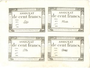 Assignats. 7 pièces imprimées, 1791-1796.. Affiche : Loi relative aux assignats de cinq livres nouvellement fabriqués... (13 novembre 1791, impr. à Pau). 4 planches d’assignats : 10 sous (24 oct. 1792, 20), 100 francs (nivôse III, 4),...