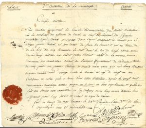 natif de La Maison Neuve (Ardèche), délivré par le conseil d’administration du 2e Bataillon de la Montagne, avec certificat de service dans le bataillon « en bon republicain » et « avec exactitude »… Ont signé 8 membres du conseil d’administration, et au dos, Augereau, général commandant la 1re division de l’Armée des Pyrénées-Orientales.. On joint une L.S. à M. Verninac à Bordeaux (janvier 1805 ; 1 p. in-4 à son en-tête, corrosions d’encre sur la signature).