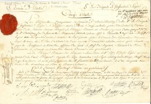 Pierre-François AUGEREAU, duc de Castiglione. P.S., signée aussi par les généraux Pierre Banel et Paul Gaultier, Loano 19 pluviôse IV (8 février 1796) ; 1 page oblong in-fol., sceau cire rouge.. Congé absolu, avec détail de ses services,...