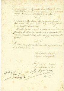 des Délibérations des consuls de la République, cachet sec Bonaparte Consul de la Rép. (qqs lég. rouss.).. Arrêté consulaire en 6 articles relatif aux conseils d’administration des divers ministères. « Le primidi de chaque décade, il se tiendra un Conseil général de finances ; le quartidi, conseil de l’administration de la guerre ; le sextidi, conseil d’administration de la marine », etc. L’extrait est signé par Maret, et « contresigné par le ministre Lucien Bonaparte »...