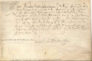 pavillons du Roy », il reconnaît recevoir du Trésorier de l’Espargne pour la somme de 3600 livres tournois « pour la pension quil plaist à Sa Maté nous donner durant la présente année »… Il écrit et signe : « pour la somme de trois mille sis cens livres Nicolas de Brichanteau Nangis ».