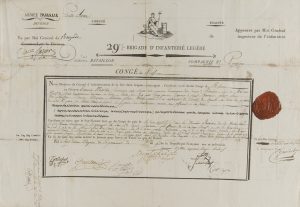 partie impr., en-tête Armée [d’Italie] corrigé à la plume en « Gallo Batave », vignette, cachet de cire rouge.. Certificat de congé de réforme donné à François Martin, lieutenant à la suite de la 1re compagnie du 2e bataillon de la 29e demi-brigade d’infanterie légère, avec signalement et détail de ses services.