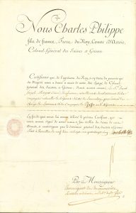 CHARLES X. P.S. « Charles Philippe », Versailles 9 juin 1785 ; contresignée par Esmangart de Bournonville, secrétaire ordinaire ; 1 page grand in-fol. en partie impr., sceau aux armes sous papier.. Suisses. Certificat du comte d’Artois,...