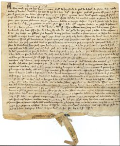 Charte. Charte, fête de la Saint-Pierre-ès-liens [1er août] 1324 ; environ 23,5 x 25 cm, lettrine.. Confirmation de la dot de Mlle Philippe Servain, épouse de messire Richard de Tallevende, avec la manière dont cette rente sera perçue après...