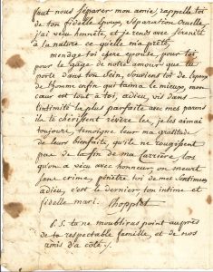 in-4 (taches).. Émouvante lettre d’adieux à sa femme avant d’être guillotiné. « Les destinées de chaque mortel sont arrêtées chere et douce amie, lorsque l’innocence opprimée ne peut se faire entendre. Le seul azile qui lui reste est dans le sein de l’éternel, il m’eut eté bien doux après avoir fidelement servi ma patrie de passer des jours sereins a tes côtés […] mais enfin puisque je n’ai pu parvenir a prouver aux hommes ma loyauté, sois convaincue chere épouse de l’innocence de l’homme qui aurait désiré ne vivre que pour toi et son pays […] j’ai vecu honnête, et je rends avec sérenité à la nature ce qu’elle m’a prêté »… On joint une P.S. (déchirée avec manques) du colonel Blondel, directeur du Dépôt de la Guerre, certifiant la condamnation et l’exécution de Chopplet (1852).