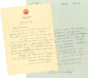 Divers. 15 lettres ou pièces, la plupart L.A.S.. Carlos de Beistegui, Henriette Caillaux, Henri Pacon, Aurore Lauth Sand (2), Jean Yonnel (5, dont 4 longues lettres à un ami, plus un programme illustré), etc. Plus des copies de lettres de Paul...