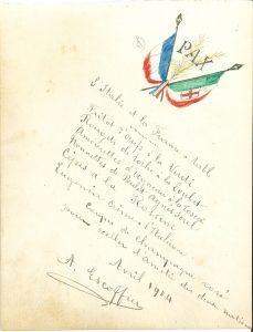 rameaux d’olivier et le mot Pax..« Fritôt d’œufs à la Verdi.Rougets de roche à la Loubet{CR}Amourettes d’agneau à la Tosca{CR}Nonnettes de poulet Agnès Sorel{CR}Cèpes à la Rossini{CR}Eugenia crème à l’Italienne{CR}Coupes de champagne rosé pour sceller l’amitié des deux nations »…