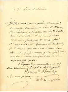colonnes ; il signe « Emml Grouchy mal des Cent Jours »… Vichy 27 juillet 1833, au colonel Vial : « je viens d’écrire au Duc d’Orléans, au Gal Sebastiani, et au Gal Miot. Je demande, de la manière la plus pressante, qu’on vous donne le 8ème régiment de dragons, et fais valoir vos droits, avec la chaleur de l’intérêt que je vous porte. Serai-je plus heureux, en ce moment, qu’à l’épôque des démarches que j’ai précédemment faites ? […] Depuis si longtems une sorte de fatâlité me poursuit »…