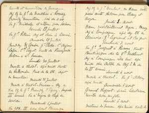 inspecteur général des services, puis major général de l’armée. Y sont consignés ses rendez-vous avec les généraux Pétain, Foch, Debeny, Gouraud, Franchet d’Esperey, Fayolle, Gérard, Joffre, Bigot, Belin, Weygand, etc., et des hommes politiques (Painlevé, Poincaré, Clemenceau, Millerand, Ferry, Strauss…), ainsi que ses déplacements, inspections, rencontres avec des officiers et délégués étrangers. 13 décembre 1917. « Vu le général Zenhewitch (russe) – déjeuné chez le général de Lacroix avec les Cambefort – reçu Mr Ceccaldi – Mr de Lamarzell – général Lafon de Ladebat »… 17 décembre 1917. « Reçu le général Gouzil – Cl Pillivuyt. Réunion chez Mr Jeanneney pour l’examen des propositions du gl Ragueneau au sujet des achats américains »… 14 avril 1918. « Le canon à longue portée tire pour la première fois de nuit »… 16 avril 1918. « Mr Painlevé revient me voir. […] Première réunion de la Commission de révision des programmes de fabrication »… 21 avril 1918. « Reçu Mr Lebrun ministre du Blocus »… 4 juillet 1918. « Revue franco-américaine place d’Iéna à l’occasion de la fête de l’Indépendance américaine, et de l’inauguration de l’avenue du Président Wilson (avenue du Trocadero). Déjeuner offert au Majestic par l’EMA aux officiers américains et aux attachés militaires étrangers : 55 couverts, tout a bien marché »… 30 septembre 1918. « L’armistice a été signé hier soir et à 12h ce matin on arrête tout »… 5 octobre 1918. « Après déj. vois le Pt du Conseil les boches offrent un armistice »… 11 novembre 1918. « à 7h téléph. que tout est signé à 5h du matin. Les hostilités seront suspendues à 11 ! Ce matin, à 11 toutes les cloches sonnent et on tire 2000 coups de canon. Beaucoup de manifestations dans les rues »… 9 décembre 1918. « Arrivée à Strasbourg à 9.30 réception inouïe. Discours de la mairie magnifique du Pt Poincaré, puis visite de la cathédrale […] à 1.30 revue place de la République c’est superbe défilé de toutes les Alsaciennes à 5 ½ visite au pont de Kehl »… 14 décembre 1918. « Arrivée de Wilson temps beau. Déj. à l’Élysée à midi ½ 300 couverts »…