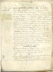Importantes lettres patentes contenant règlement pour la Banque générale accordée à Law et à sa compagnie, signées « Par le Roy le Duc d’Orleans Regent present ».. Ayant accordé à Law par lettres patentes du 2 mai « le privilege d’établir dans nostre Royaume, et de tenir pendant le temps de vingt années une Banque generale, avec la faculté de stipuler, tenir leurs livres, et faire leurs Billets en écus d’especes, sous le nom d’ecus de Banque », le Roi fait un règlement général, de l’avis de son oncle, le Régent, ses cousins les ducs de Bourbon et du Maine, son oncle le comte de Toulouse, « et autres Pairs de France, grands et notables personnages de nôtre Royaume ». Ce règlement en 21 articles précise les conditions de fonctionnement de la Banque : la composition des fonds, la tenue d’un registre, la situation et les heures d’ouverture, les assemblées, le bilan annuel, les caisses, les billets de banque, l’escompte, etc., et des interdictions concernant le commerce de marchandises, les assurances maritimes, les billets payables à terme... « XI. Les billets de la Banque seront signez par le directeur, et par un des associez qui sera nommé à la pluralité des voix dans la premiere assemblée, et visez par l’Inspecteur, et il en sera fait dans une seule fois, la quantité qui sera jugée necessaire, lesquelz seront enregistrez par numero, dattes et sommes, sur un livre tenu à cet effet. XII. Le sceau de la Banque sera apposé aux Billets en presence du directeur, de l’Inspecteur et du Tresorier ; après quoy lesd. billets qui auront esté signez, visez et scellez, seront enfermez dans la caisse generale, ainsi que le sceau de la Banque, et les planches sur lesquelles lesdits Billets auront esté gravez. XIII. Quand les Caissiers auront besoin d’argent, le Tresorier leur en fournira, retirant en même temps la valeur en Billets ; il leur en fournira de même des billets, et retirera d’eux la valeur en argent, la même operation sera faite entre la caisse du Tresorier et la caisse generale, de manière que la caisse confiée au Tresorier et aux caissiers, ne poura jamais exceder la somme de deux cent mille ecus »… Etc.
