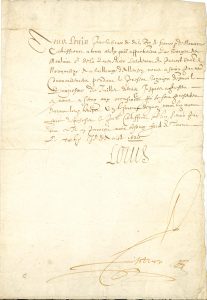 LOUIS XIII (1601-1643) Roi de France. P.S. (secrétaire), Tours 24 août 1620 ; contresignée par Potier ; 1 page in-fol.. Certificat pour Georges des Moulins sieur de La Queustière, lieutenant du prévôt général de Normandie du bailliage...
