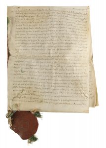 Duché du Luxembourg. Charte, Luxembourg 16 mai 1599 ; cahier de vélin in-fol. de 7 pages, grand sceau de cire rouge pendant sur cordelette rouge et verte.. Sentence du gouverneur, président et gens du Conseil de Luxembourg de Leurs Altesses...