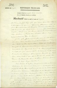 Alexandre MACDONALD (1765-1840) duc de Tarente, maréchal d’Empire. L.A.S., Q.G. de Naples 27 ventôse VII (17 mars 1799), au commissaire des guerres Valville ; 1 page et quart grand in fol., en-tête Macdonald Général en chef de l’armée de...