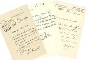 Maréchaux. 5 L.A.S. et 1 L.S. de maréchaux de la Première Guerre mondiale (ou de l’après-guerre).. Émile Fayolle, Ferdinand Foch (2), Louis Franchet d’Espèrey, Hubert Lyautey, Philippe Pétain.