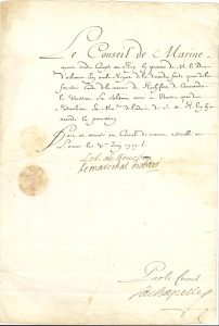 1 page in-fol. (sceau sous papier).. « Le Conseil de Marine ayant rendu compte au Roy en presence de M. le Duc d’Orleans son oncle Regent de la demande faite par de La Forestrie garde de la marine de Rochefort de commander le vaisseau Le Solitaire arimé a Nantes par des patrouliers Sa Maté de l’advis de S.A.R. luy en a accordé la permission »...