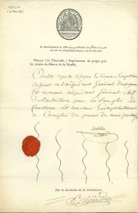 (10 décembre 1794) ; contresignée par le secrétaire de la Commission Bréjard ; 1 page in-fol. à son en-tête, vignette et sceau cire rouge républicains.. Représentant du peuple près les armées du Rhin et de la Moselle, Merlin arrête « que le citoyen Le Camus capitaine adjoint à l’adjudant général Duvigneau est nommé adjudant général chef de bataillon pour en remplir les fonctions et toucher les appointements à compter du premier du mois prochain »…