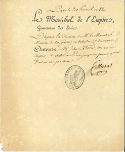 Joachim MURAT (1767-1815) maréchal d’Empire, Roi de Naples. P.S., Paris 30 prairial XII (19 juin 1804) ; demi-page in-4, en-tête Le Maréchal de l’Empire, Gouverneur de Paris, cachet encre État major de la 1re Division militaire.. Il...
