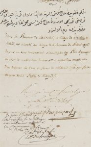 province de Calloubié, le village de Choubian Hariss, est accordé au Kiaya de la caravane du pelerinage depuis un tems immemorial » ; on prie d’en délivrer les titres en faveur de Mehemad Aga, qui fait office de Kiaya… Bonaparte a donné l’ordre de renvoyer la demande au citoyen Poussielgue qui, comme administrateur général des finances, prie l’intendant général « de vérifier si ce village est réellement affreté à la Caravanne »… Au verso, apostilles signées de Poussielgue et des administrateurs Magallon et Pagliano.