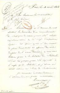 Michel NEY. L.S. « Neÿ », Paris 10 avril 1808, au ministre de la Guerre Clarke ; 1 page in-fol., cachet Secrétat parter.. Il appuie la demande d’un commandement de compagnie de réserve pour le capitaine Alliot, retiré du 31e régiment...