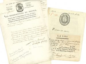 d’une pétition au Directoire, 1798). Nicolas Luckner (fin de l.s., cosignée par ses aides de camp, dont les futurs généraux de Beurnonville, Mathieu Montmorency et Ihler). Extrait de naissance de Commune-Affranchie. Lettres ou circulaires des Sociétés des Amis de la Constitution à Chalon-sur-Saône et Autun, et de l’Agent supérieur du Conseil exécutif près l’Armée de l’Ouest Alexandre. Numéro du journal Le Sans-Culotte.