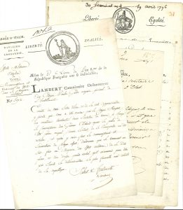 RÉVOLUTION ET EMPIRE. 18 lettres ou pièces, la plupart L.S. ou P.S., plusieurs avec en-tête et vignette.. Aubert-Dubayet, Benezech, Lazare Carnot, Charles Cochon, François de Neufchateau (griffe), Gaudin, Jeanbon Saint André, Lambert, Hugues...