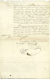 Tribunal révolutionnaire. P.S. par le greffier Paris, 8 vendémiaire III (29 septembre 1794) ; 1 page et demie grand in-fol. à en-tête et cachet encre du Tribunal révolutionnaire.. Jugement de non-lieu et ordre de mise en liberté des citoyens...