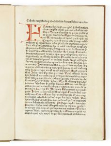 Jolie impression en gothique bâtarde de 35 lignes sur 1 colonne, les lettrines, pieds-de-mouche et majuscules ont été peints ou rehaussés en rouge.