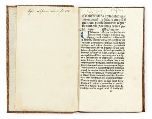 Premier livre à avoir été imprimé à Gand, le présent exemplaire de la Rhetorica divina de Guillaume d’Auverne est en seconde édition, la première date de 1472.