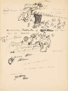 Dessin original à l’encre sur papier figurant de nombreux personnages légendés de leurs noms de la main de Maurice Sachs (William Hangover-Wale, Miss Gwendolyne Marshmallow of Bay-Rum, Joseph dit Ho-Le-Barman, Dignikowski, un chef d’orchestre polonais, etc).