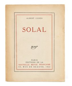 ALBERT COHEN - 1895-1981 - Solal. Paris, N.R.F., 1930. In-8 broché. Édition originale. Un des 109 exemplaires réimposés (n°38, tirage de tête.).